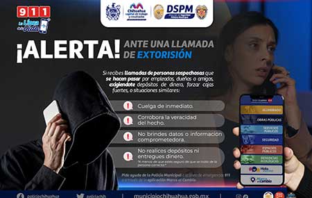 Chihuahua.- A fin de evitar que las y los empleados domésticos o de establecimientos comerciales se conviertan en víctimas de extorsionadores telefónicos, el Gobierno Municipal a través de la Dirección de Seguridad Pública (DSPM), emite recomendaciones que ayudarán a evitar caer en este engaño de personas que buscan obtener dinero fácil a través del engaño y otras artimañas.