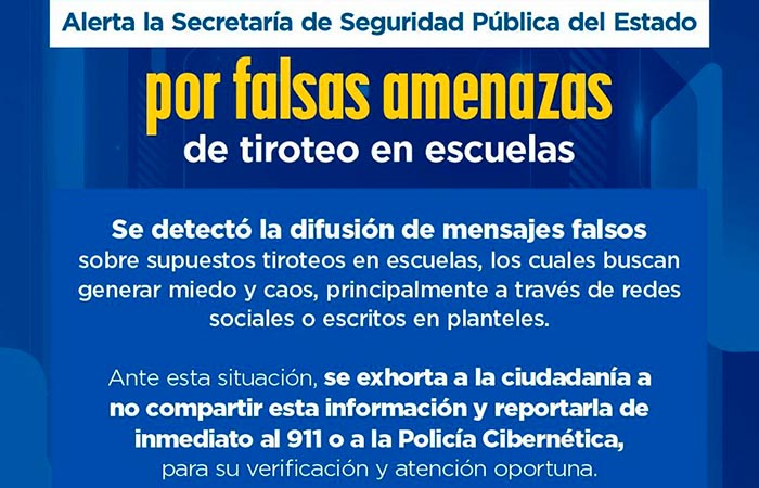 Ante esta situación, la el titular de la SSPE, Gilberto Loya, exhortó a la ciudadanía a no difundir este tipo de mensajes y a reportarlos de inmediato al número de emergencias 911, a fin de que las autoridades realicen la verificación correspondiente y activen los protocolos de atención.