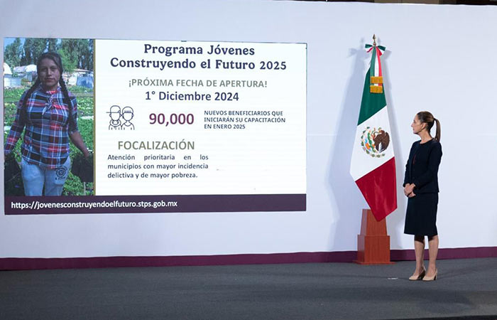 Ciudad de México.- Con la finalidad de continuar garantizando el derecho al trabajo y como estrategia para fortalecer la construcción de la paz, la Presidenta de México, Claudia Sheinbaum Pardo, anunció la inscripción para el Programa Jóvenes Construyendo el Futuro, la cual comienza el próximo 1 de diciembre a través de la página: https://jovenesconstruyendoelfuturo.stps.gob.mx/.