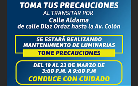 Chihuahua.- El Gobierno Municipal, a través de la Dirección de Mantenimiento Urbano, informa que darán mantenimiento a las luminarias de alumbrado público en calle Aldama, por lo que exhortan a circular con precaución ya que se limitará el paso vehicular en un carril.