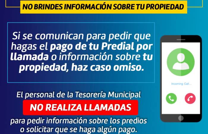 Chihuahua.- El Gobierno Municipal, a través de la Tesorería Municipal, exhorta a la población en general a no brindar información de sus propiedades a través de llamadas telefónicas; asimismo se informa que las y los empleados de la institución no realizan llamadas a las y los contribuyentes para pedir información sobre su propiedad o para que realicen algún pago del Predial.