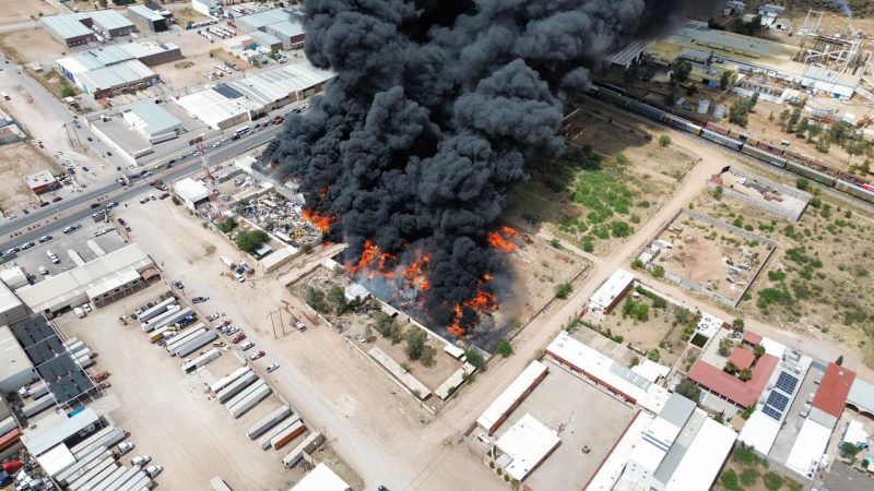 Chihuahua.- La tarde de este domingo personal del H. Cuerpo de Bomberos se encuentra atendiendo y trabajando en la sofocacion total del incendio registrado en la empresa Procesadora y Recicladora de Materiales Industriales, ubicada en las calles Sierra de la Cal y calle 57, en la colonia Primero de Mayo, donde se almacenaban cerca de 160 toneladas de plástico.