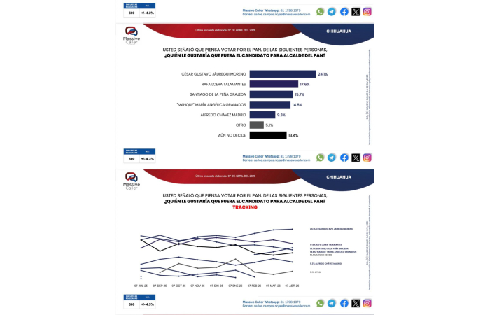 Chihuahua.- A poco más de un año del proceso electoral de 2027, la carrera interna en el PAN por la alcaldía de Chihuahua se mantiene; César Jáuregui y Rafa Loera, mantienen el primer y segundo lugar respectivamente.