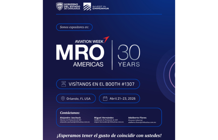 Chihuahua.- El Gobierno del Estado de Chihuahua, a través de la estrategia Invest in Chihuahua, participará en MRO Americas 2026, el evento más relevante a nivel mundial en mantenimiento, reparación y overhaul (MRO) aeronáutico, que se llevará a cabo en Orlando, Florida.