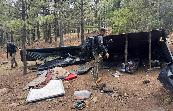 Tras la localización aérea, dos patrullas peatones fueron desplegadas para verificar el sitio, y confirmaron la existencia del campamento habilitado con insumos como alimentos, agua, utensilios de limpieza, cobijas, paneles solares y baterías, cubiertos con una carpa improvisada con hule negro.