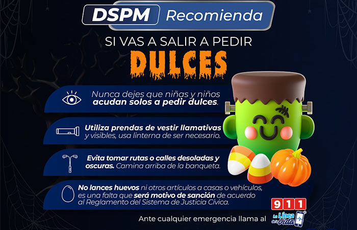Chihuahua.- Para quienes saldrán esta noche con las y los pequeños a pedir dulces durante la celebración de Halloween, la Dirección de Seguridad Pública Municipal (DSPM) emite recomendaciones que ayudarán a evitar incidentes y regresar con bien a casa.