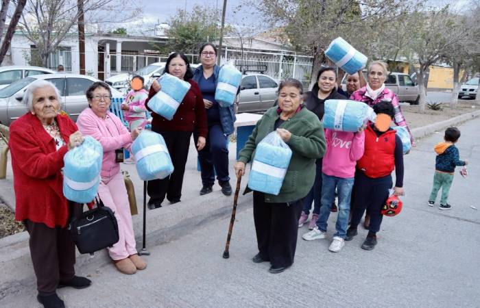 Chihuahua.- En atención a la temporada invernal, la diputada del Partido Acción Nacional (PAN), Carla Rivas, visitó la colonia San Jorge, donde hizo entrega de cobijas a las familias como una acción de apoyo ante las bajas temperaturas que se registran en la ciudad.
