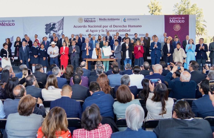 Ciudad de México.- La Presidenta de México, Claudia Sheinbaum Pardo, firmó el Acuerdo Nacional por el Derecho Humano al Agua y la Sustentabilidad, que une a empresarias, empresarios, instituciones académicas, así como a los 32 gobernadores y gobernadores para garantizar el agua como un bien nacional y un derecho de todas y todos los mexicanos, esto como parte del Plan Nacional Hídrico 2024-2030.