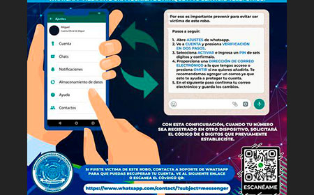 “La verificación en dos pasos puede incluir un mensaje de texto, un correo electrónico, una pregunta de seguridad o incluso la instalación de una aplicación específica para esta función, la cual contribuirá a dificultar el ingreso de los delincuentes que operan en la red a los datos de cada persona”, agregó el funcionario.