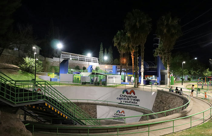 Chihuahua.- El Gobierno Municipal, a través de la Dirección de Mantenimiento Urbano, modernizó el alumbrado público del parque Aventura, ubicado en las inmediaciones de la avenida La Cantera, para mejorar la visibilidad y seguridad de los usuarios.