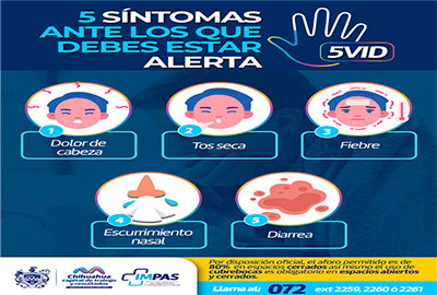 Ciudad de Chihuahua.- El Gobierno Municipal de Chihuahua, a través del Instituto Municipal de Prevención y Atención a la Salud (IMPAS), informa a las y los chihuahuenses acerca de los síntomas para identificar casos positivos de COVID-19.