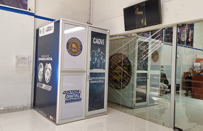 Chihuahua.- Con el fin de promover la cultura de la denuncia de delitos de una manera fácil y accesible para la comunidad, la Dirección de Seguridad Pública Municipal (DSPM) en colaboración con la Fiscalía General del Estado, instaló una cabina de atención de denuncia digital en la Comandancia Norte, donde las y los ciudadanos pueden acudir a reportar un hecho criminal.