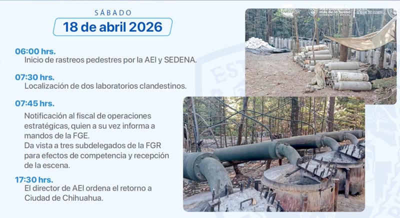 Chihuahua.- La titular de la Unidad Especializada para investigar los hechos ocurridos entre el 17 y el 19 de abril, Wendy Paola Chávez Villanueva, emitió un informe sobre los avances que al momento se tienen en relación con el operativo que condujo al desmantelamiento de un laboratorio de metanfetaminas y drogas sintéticas en el municipio de Morelos.