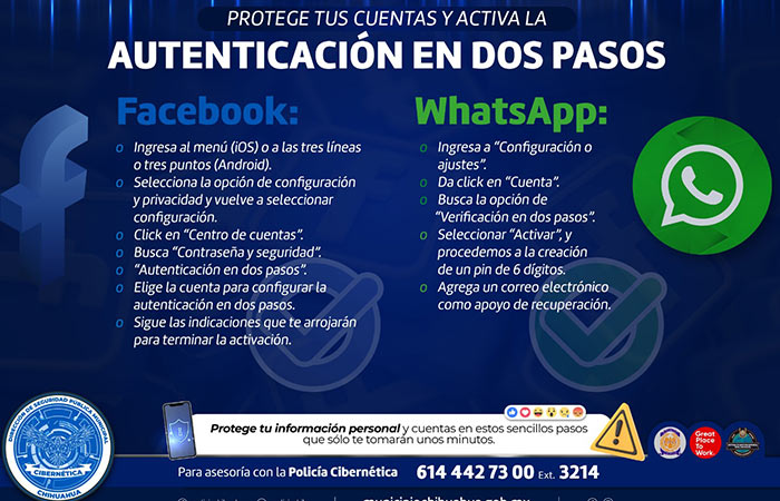 Chihuahua.- Para evitar la vulneración de cuentas de redes sociales como WhatsApp o Facebook, la Dirección de Seguridad Pública Municipal (DSPM), a través de su Policía Cibernética, exhorta a los usuarios a realizar la verificación en dos pasos.