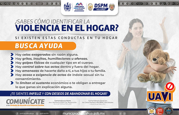 Chihuahua.- La Dirección de Seguridad Pública, reitera la invitación a mujeres u hombres que estén pasando por violencia, alzar la voz y pedir ayuda en las Unidades de Atención a la Violencia Familiar (UAVI), que se encuentran en ambas comandancias.