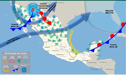 Chihuahua.- La Coordinación Estatal de Protección Civil (CEPC), indicó que, para este lunes 23 y martes 24 de enero, el ingreso del frente frío número 27 en interacción con la Cuarta Tormenta Invernal, causará un marcado descenso en el valor de las temperaturas en todo estado, además de la posibilidad de presencia de nieve, aguanieve durante este inicio de semana así como intensas rachas de viento.