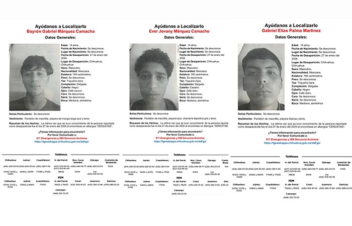 Chihuahua. – La Fiscalía General del Estado de Chihuahua emitió una alerta de búsqueda para localizar a tres adolescentes que desaparecieron de manera simultánea el pasado 27 de enero de 2026 en el municipio de Chihuahua. Se trata de Gabriel Elías Palma Martínez, de 16 años; Ever Jovany Márquez Camacho, también de 16 años; y Bayrón Gabriel Márquez Camacho, de 15 años. Los tres jóvenes fueron vistos por última vez en el albergue CENCATAD, ubicado en la ciudad capital.